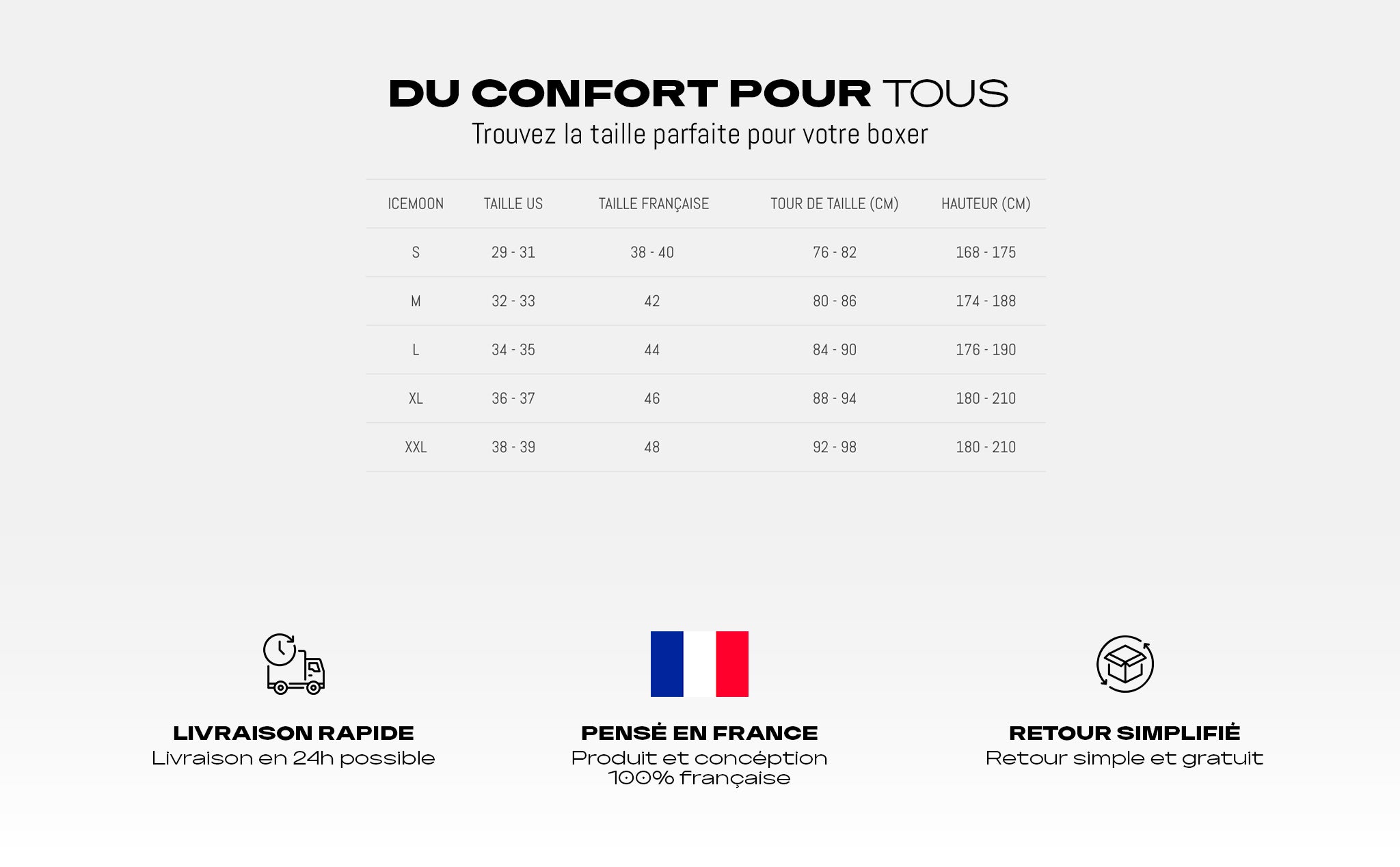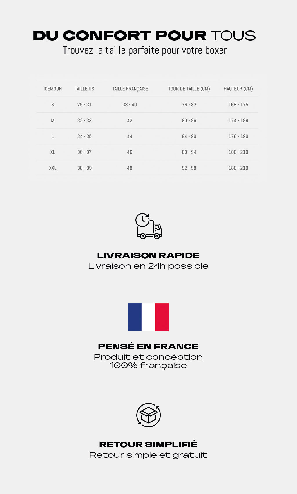 Découvrez la douceur des boxers ICEMOON. Un boxer parfait est un vêtement qui vous accompagne tout en épousant vos mouvements à la perfection. Avec la qualité des boxers ICEMOON, redécouvrez la douceur d’un coton haut de gamme et une coupe étudiée pour maintenir les cuisses sans jamais remonter. Recommandé par des sportifs professionnels, les boxers ICEMOON vous accompagnent au quotidien comme à l’entraînement.